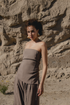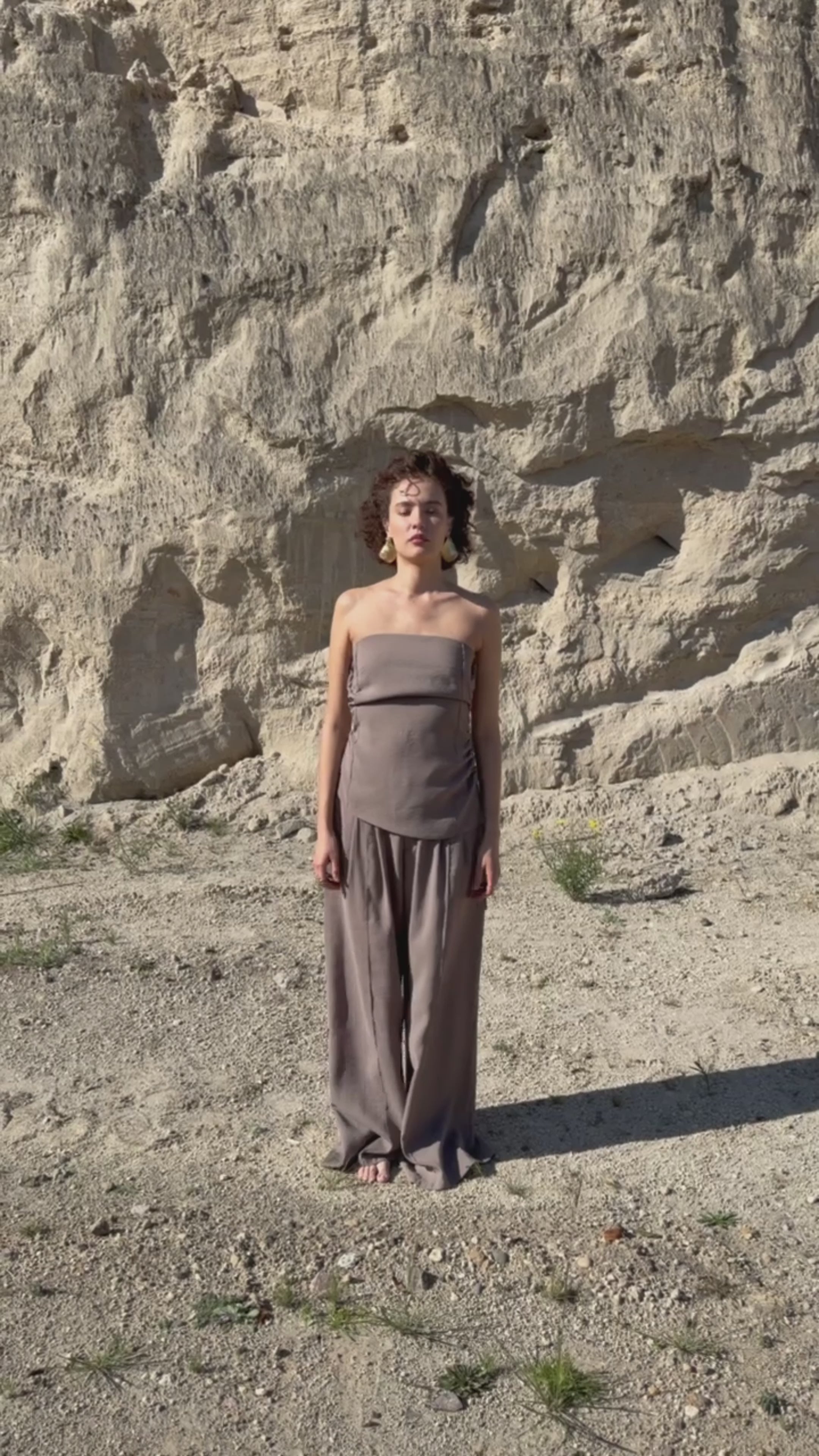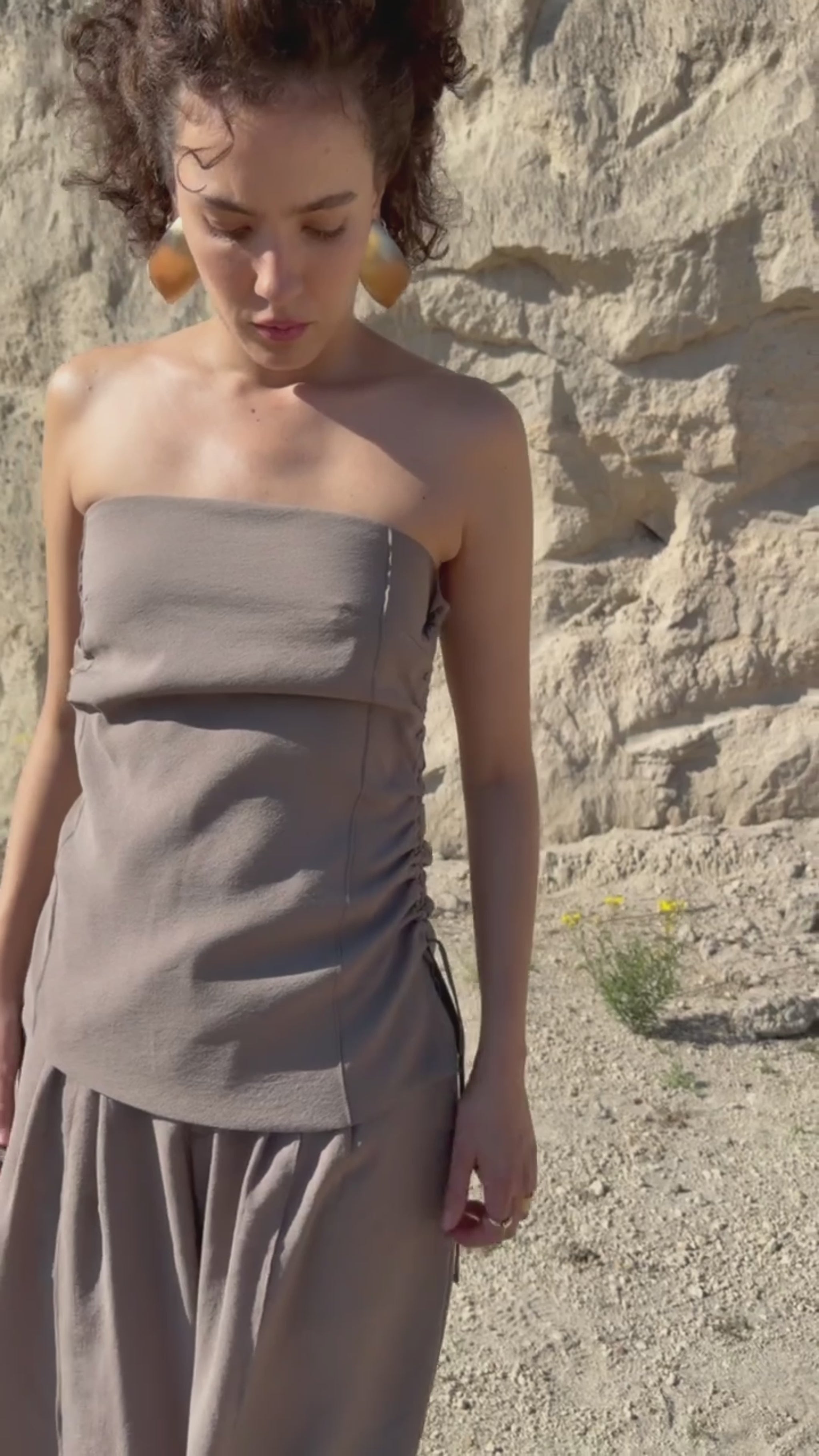 The Mher Top is a strapless silhouette designed to highlight the body with effortless structure. Crafted in lightweight dobby fabric with a soft texture, it features subtle draping and side ruching that enhances the natural shape. Made with lyocell fibers, known for their lower environmental impact and breathable feel, this piece blends refined design with conscious craftsmanship.